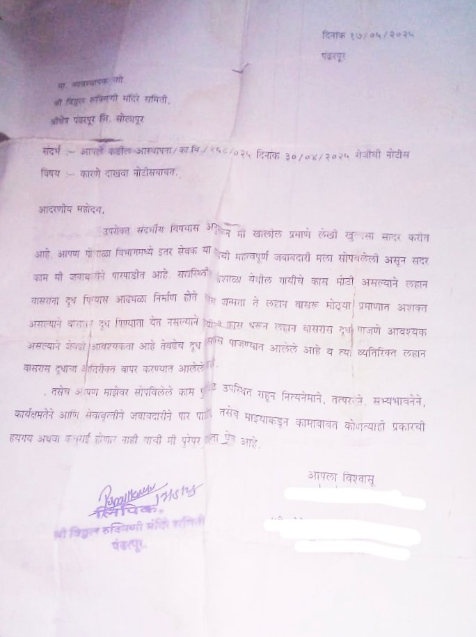 ( आस्थापना/ का वि/ 268/025 दिनाक 30/4/2025 ) या नोटीस द्वारे त्यांचा लेखी खुलासा घेण्यात आला. दोन्ही कर्मचाऱ्यांनी 17 मे रोजी समितीकडे लेखी खुलासा सादर केला. आणि समितीने गोवश हत्येची फाईल बंद करून टाकली. यावर समितीचे सदस्य आणि अधिकाऱ्यांमध्ये चर्चा देखील झाल्याची माहिती मिळत आहे. मात्र प्रत्येकाने या घटनेवर पडदा टाकण्याचे पाप केले. व्हिडिओ सोशल मीडियावर व्हायरल झाल्यानंतर समितीचे सहअध्यक्ष ह भ प गहिनीनाथ महाराज औसेकर, कार्यकारी अधिकारी राजेंद्र शेळके यांना संपर्क साधून प्रतिक्रिया घेण्याचा प्रयत्न केला. मात्र त्यांनी प्रतिक्रिया देण्याचे टाळले आहे. व्यवस्थापक मनोज क्षोत्री यांनी सामान्य नागरिकांचे मोबाईल नंबर ब्लॉक केले असल्याने त्यांच्याशी संपर्क होऊ शकला नाही. मात्र व्हिडिओ व्हायरल झाल्याच्या बातम्या आल्यानंतर व्यवस्थापक आणि गोशाळेतील कर्मचाऱ्यांना बोलवून व्हिडिओ लिक कसा झाला ? इतकी काळजी घेऊन बाहेर कसा पडला ? याचा जाब विचारला आहे.